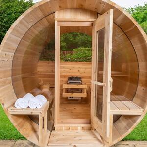 In Ihrer eigenen exklusiven Gartensauna kommen Sie vollständig zur Ruhe. Die Fasssauna aus White Cedar hat durch ihre runde Form eine wesentlich kleinere Heizfläche. Die runde Form sorgt für eine gute Luftzirkulation, wodurch sich die Sauna schnell und effizient aufheizt.