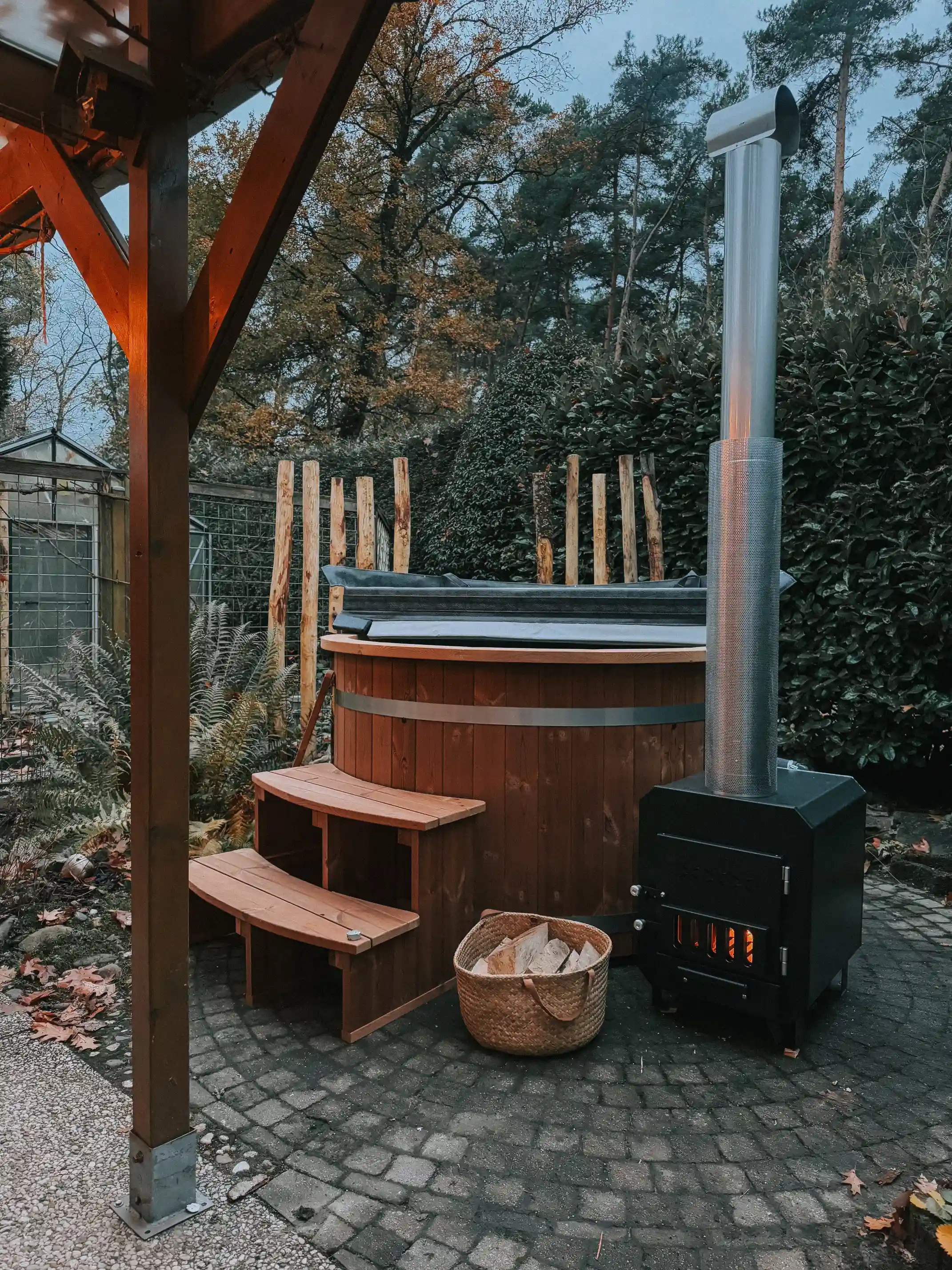 WonderWild hat sich dafür entschieden, einen wunderschönen ⌀160 cm großen holzbefeuerten Ticra-Whirlpool mit externem Ofen installieren zu lassen.