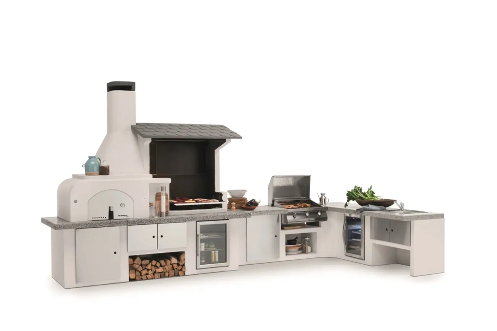 Your Palazzetti Italian outdoor kitchen comes as a construction package. Each module consists of a concrete base, with (where applicable) a worktop and extensions such as a sink or barbecue. The base should be put in the desired spot by 2 to 3 people. The modules can be glued together using the adhesive supplied. Next, attach optional extras (barbecue/oven/doors, etc.). Finally, paint the concrete white with the exterior paint specially provided. Once everything is dry, you’ll be able to put your cooking skills to the test!