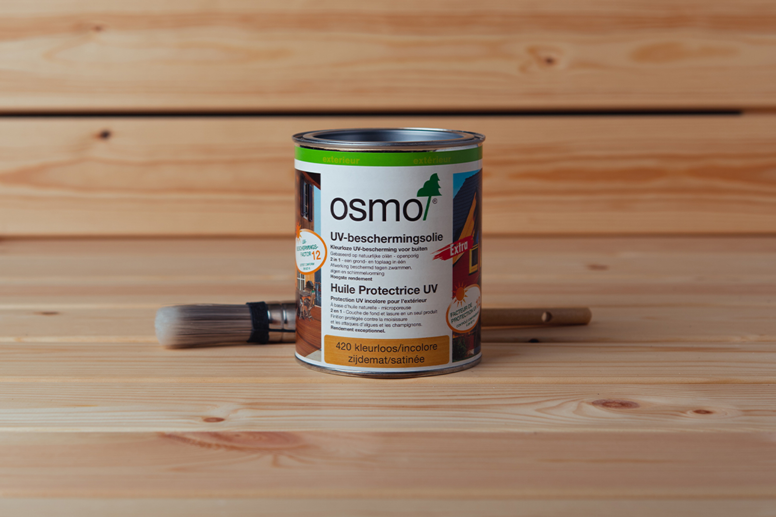 Deuxièmement, le produit est principalement utilisé comme finition sur du bois déjà teinté ou traité d’une autre manières ; il peut s’agir de différentes finitions de couleur Osmo. Le fait que le produit ait un facteur de protection UV de 12 par rapport au bois non traité prolonge considérablement la durée de vie de la surface, tout en ralentissant le processus de vieillissement. Il existe plusieurs couleurs pour l'huile de protection UV, ces couleurs sont liées aux couleurs des différents types de bois auxquels elles doivent leurs noms (ces couleurs ne conviennent donc pas uniquement aux types de bois auxquels elles doivent leurs noms). L'huile de protection UV 420, incolore, ne contient aucun pigment de couleur et souligne de ce fait la couleur du bois. La 429 Natural est conseillée uniquement sur les types de bois clairs ; cette variante contient en effet un pigment blanc dans le produit Sur les surfaces sombres, la 429 peut créer un voile blanc. Effectuez toujours un test d'abord pour voir si le produit donne l'effet souhaité.