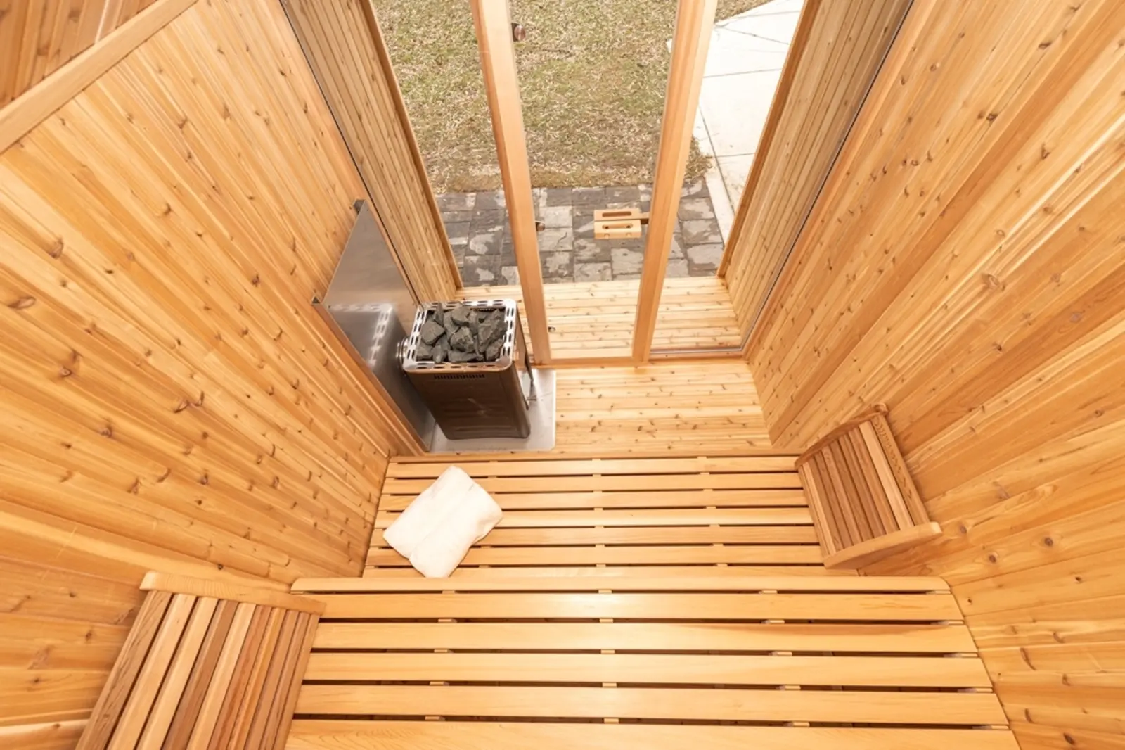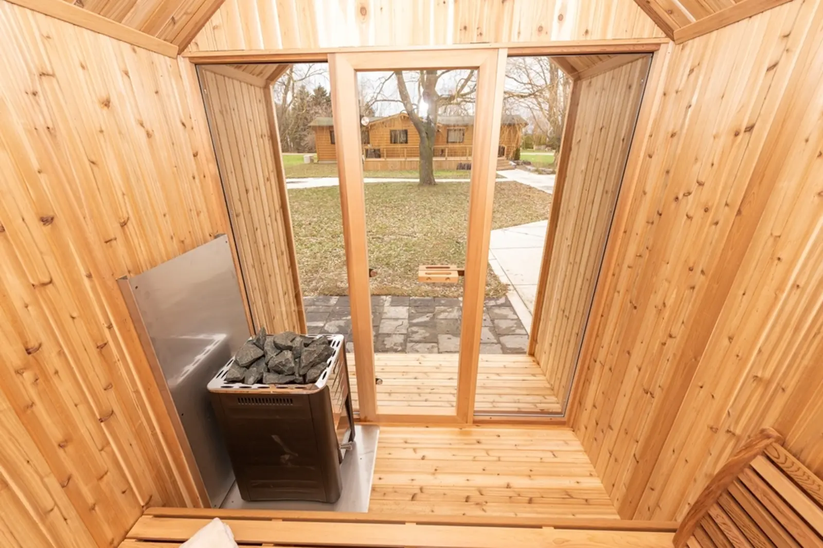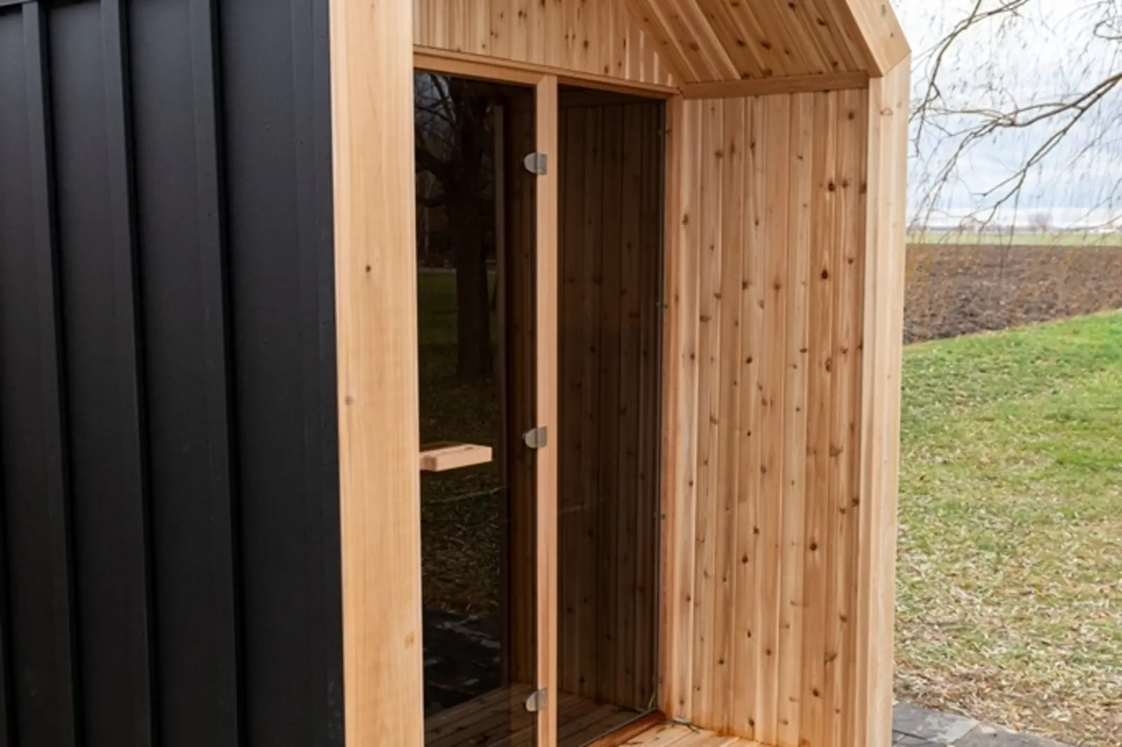 La façade du sauna Hudson est entièrement en verre. Vous avez besoin de plus d'intimité dans votre sauna extérieur ? Avec des panneaux semi-occultants et/ou du verre miroir en option, vous pouvez facilement créer l'intimité que vous souhaitez.