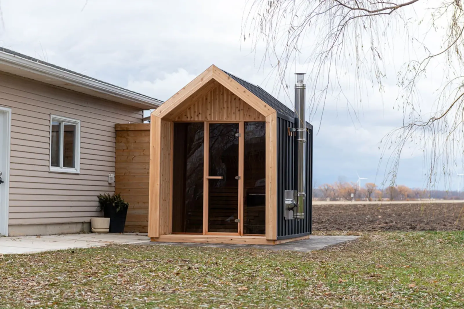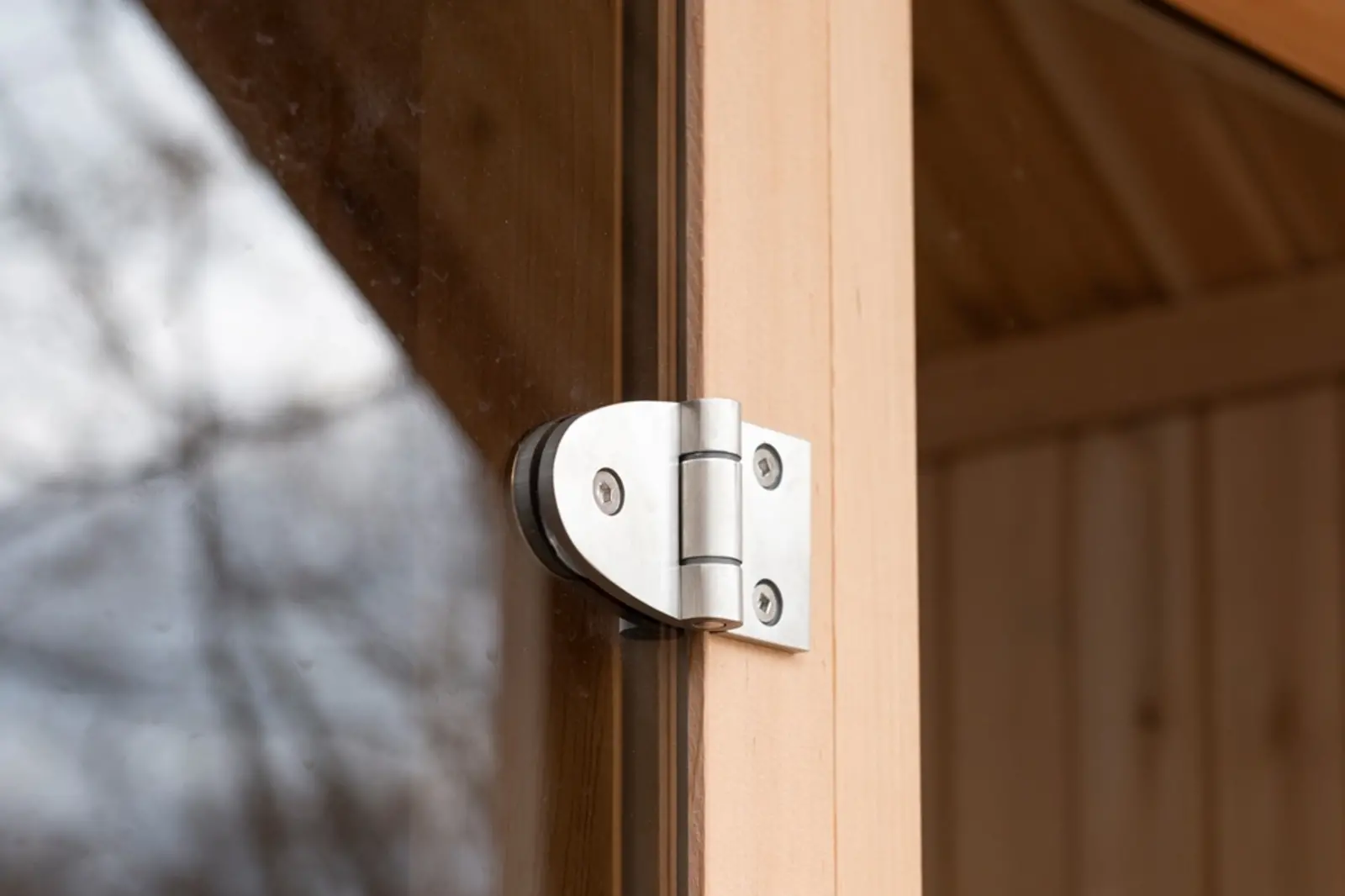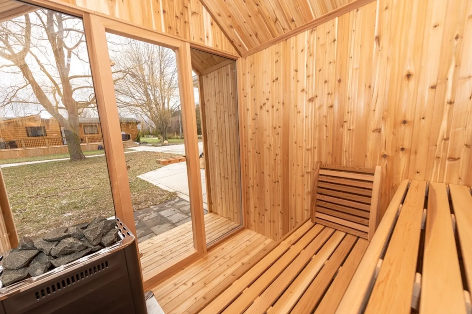 La façade du sauna Hudson est entièrement en verre. Vous avez besoin de plus d'intimité dans votre sauna extérieur ? Avec des panneaux semi-occultants et/ou du verre miroir en option, vous pouvez facilement créer l'intimité que vous souhaitez.