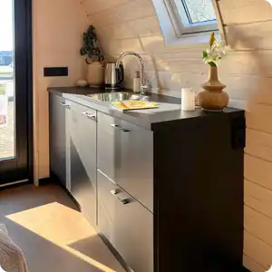 Binnen is de camping pod stijlvol afgewerkt met vuren puntschroten, behandeld met een whitewash voor een lichte en ruimtelijke uitstraling. De vloer bestaat uit een duurzame PVC-clickvloer in de kleur eiken 7840, wat zorgt voor een warme en moderne afwerking. Deze camping pod is de ideale oplossing voor wie comfort, uitstraling en duurzaamheid wil combineren in een compacte ruimte.