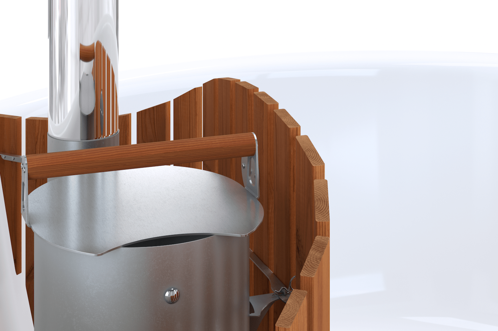 - uitneembare houten afscheiding, waarmee de kachel en kachelpijpen zijn afgeschermd van het bad