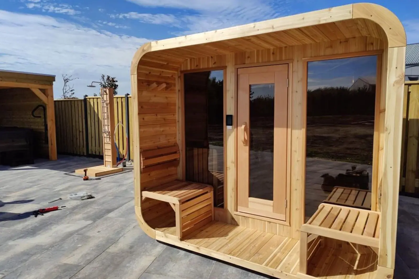 Kom volledig tot rust in je eigen exclusieve buitensauna met veranda. De Luna sauna is een ruime buitensauna waarin je heerlijk samen kunt genieten. Door haar rechte vorm met afgeronde hoeken is de sauna ruim van binnen en een plaatje om te zien. De sauna is 100% cederhout, wat een heerlijke aroma vrijgeeft tijdens je saunabezoek.