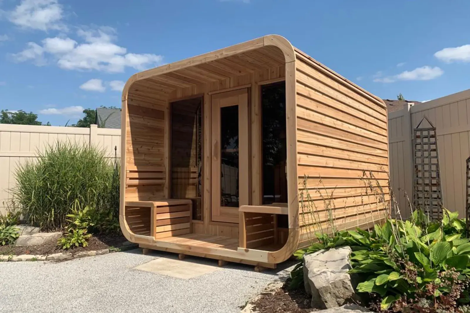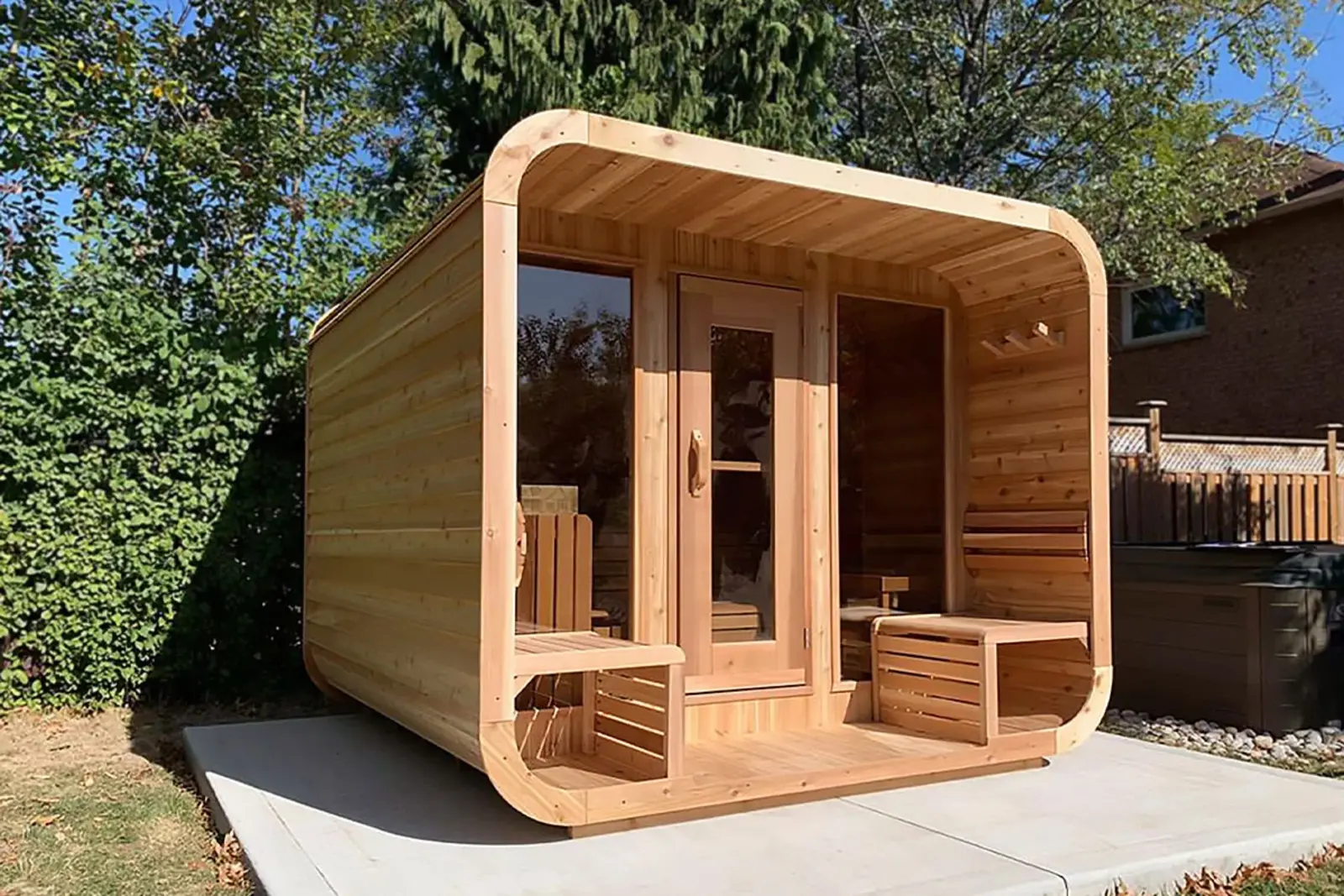- red cedar buitenzijde met afgeronde dakafwerking en EPDM dakbedekking