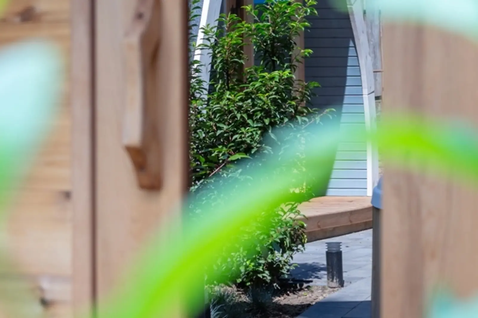 - red ceder-houten deur met getint glas en magnetische sluiting