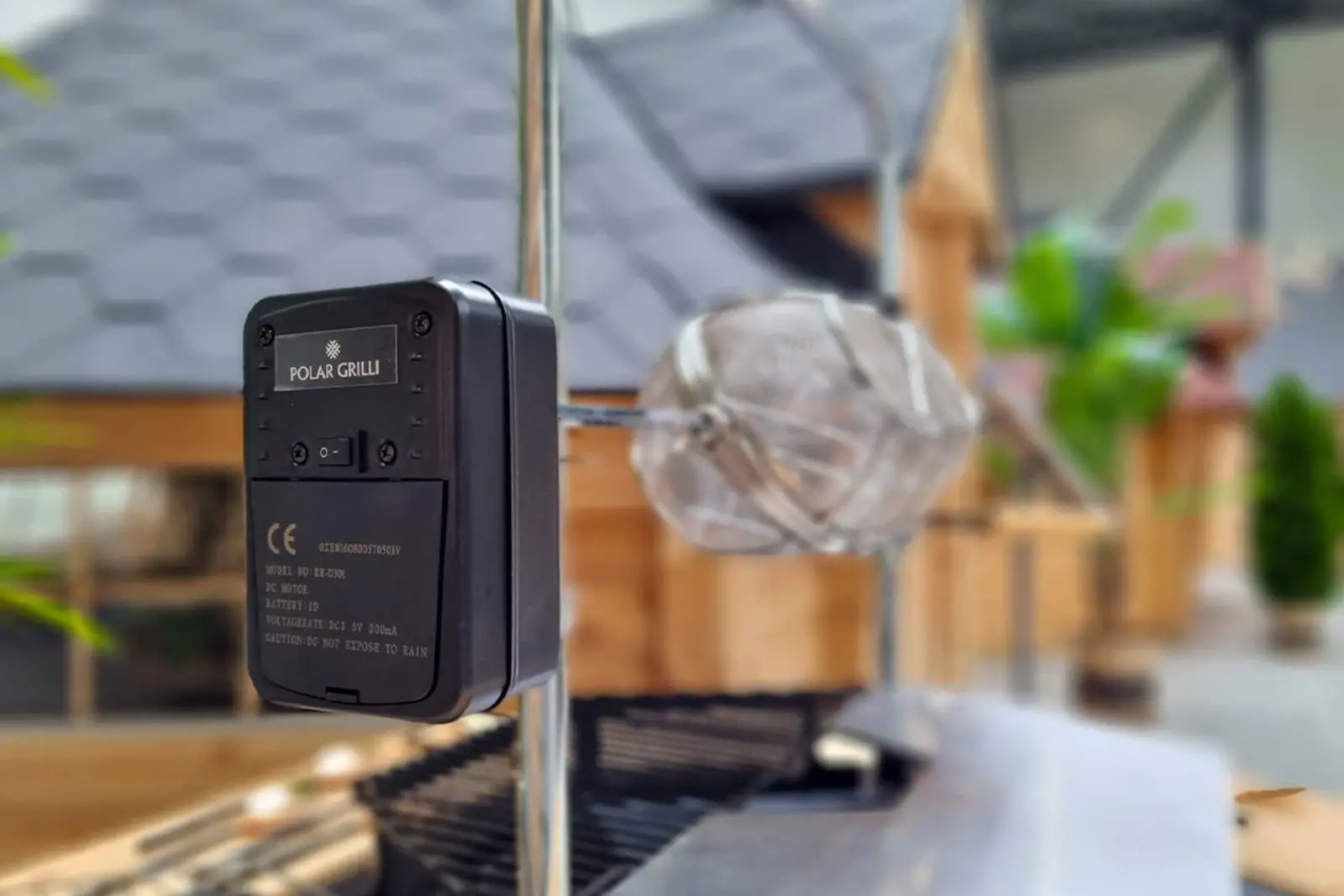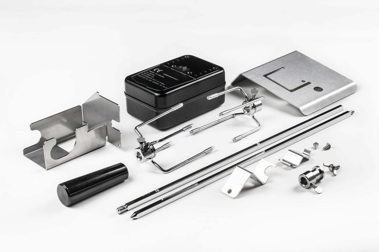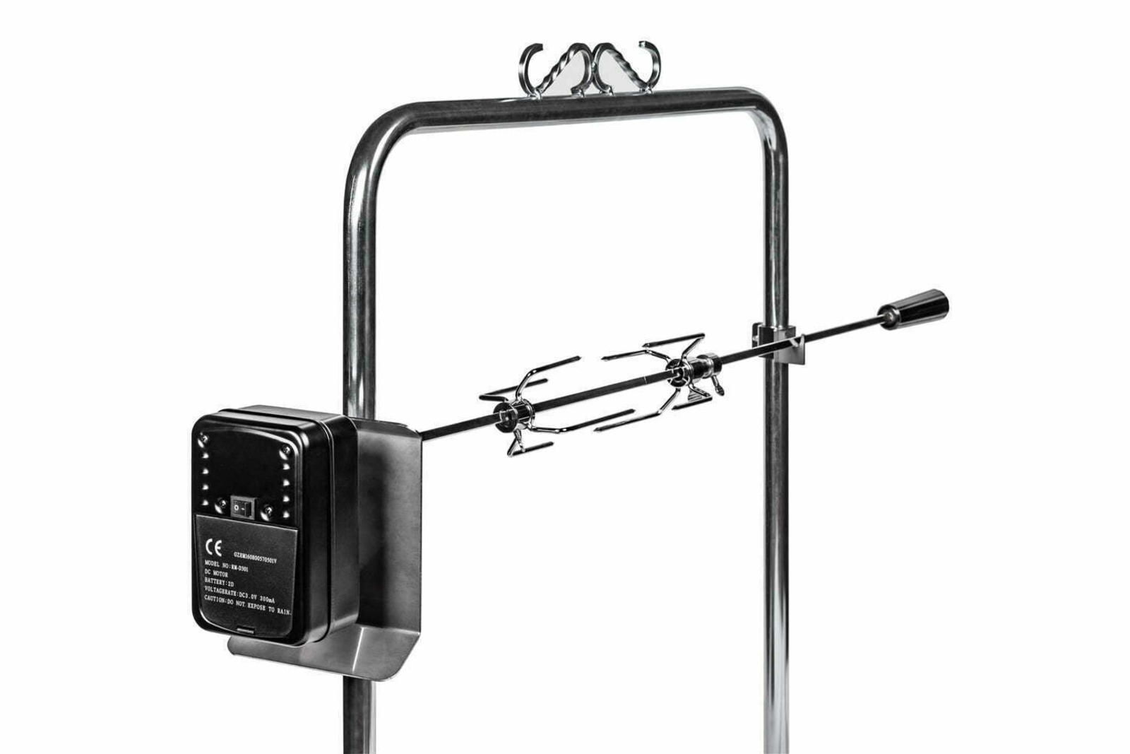 Met deze op maat gemaakte rotisserie set kan je overheerlijke kebab, kalkoenen, kip en andere lekkernijen bereiden. De stille motor wordt aangedreven door batterijen en draait het spit langzaam rond. Hierdoor wordt het vlees gelijkmatig gegrild. Laat de rotisserie voor je grillen en geniet van het resultaat!