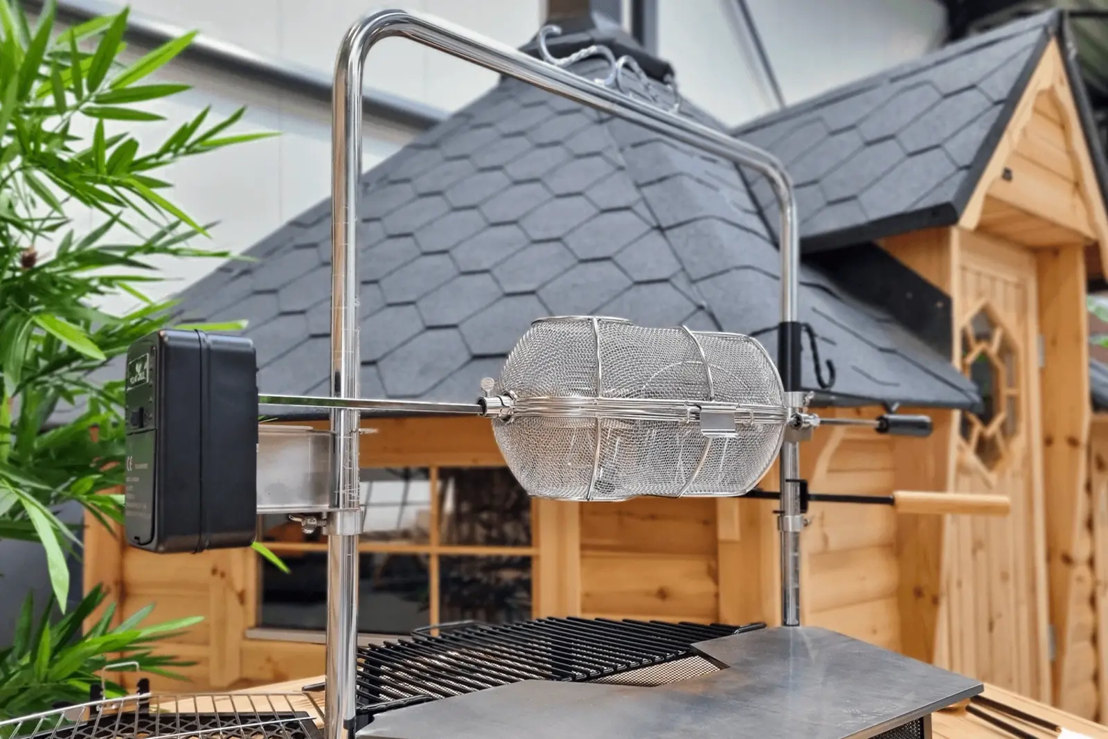Inbegrepen in deze set is is een rotisseriemand van roestvrij staal. Deze mand kan gebruikt worden voor het bereiden van onder andere heerlijke krokante kippenvleugels.