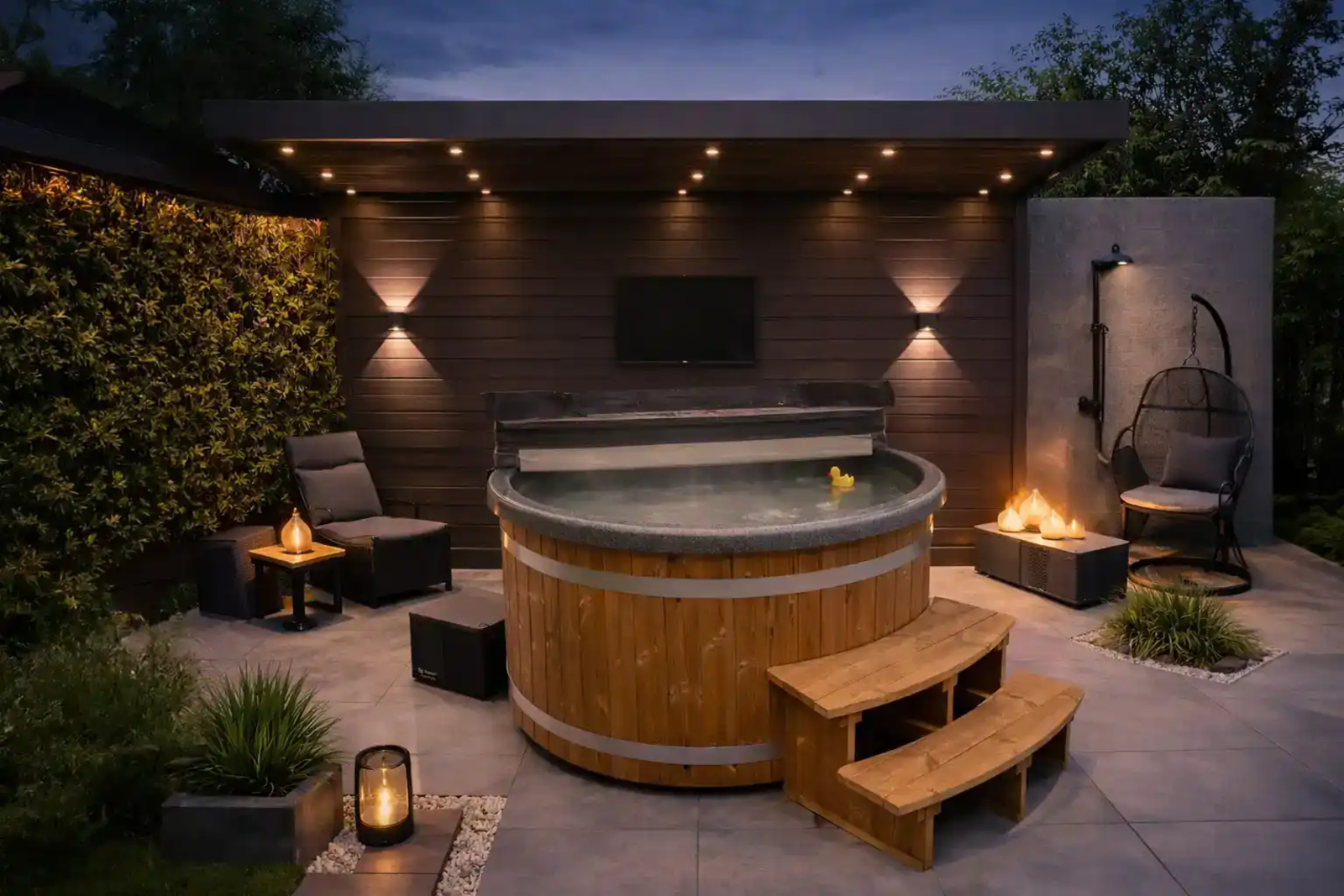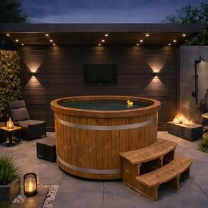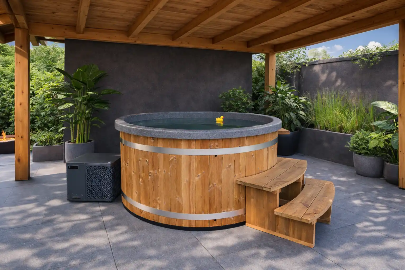 TICRA hottub ⌀160 met thermowood bovenrand en warmtepomp 5kW